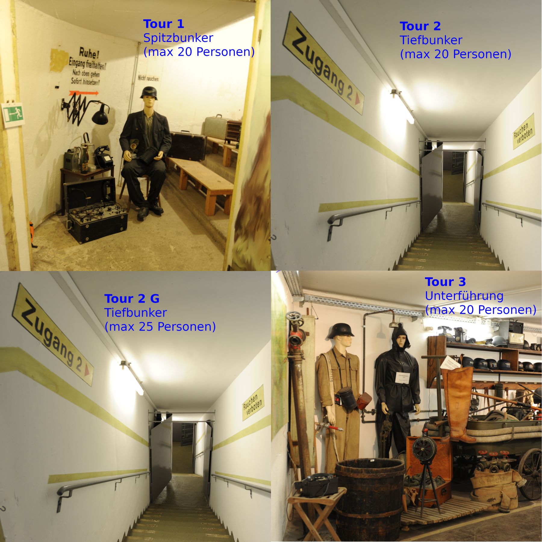 Zu diesem Termin können wir ihnen eine Gruppenführung für bis zu 20 Personen wahlweise als Tour 1 Spitzbunker oder als Tour 2 Tiefbunker (auch als 2+ für große Gruppen bis zu 25 Personen) oder als Tour 3 Unterführung anbieten.